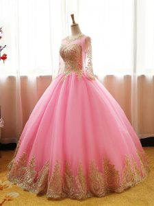 Pink Long Sleeves Appliques Floor Length Ball Gown Prom Dress
