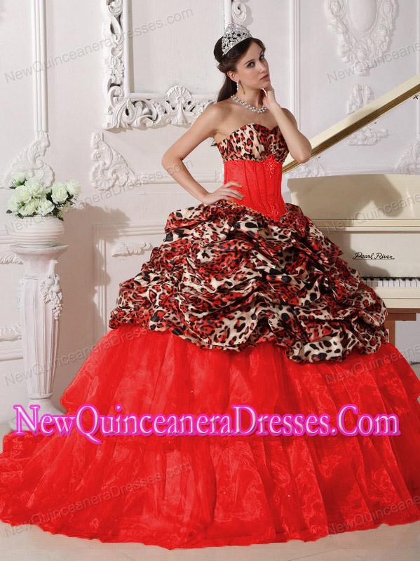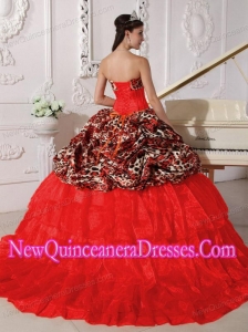 Plus Size Red Ball Gown Sweetheart Sweep / Brush Train Leopard and Organza with Appliques Quinceanera Dresses