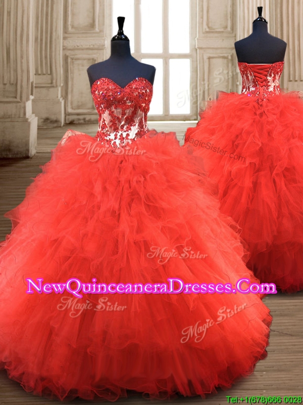 Fashionable Halter Top Beaded Tulle Quinceanera Dress in Red