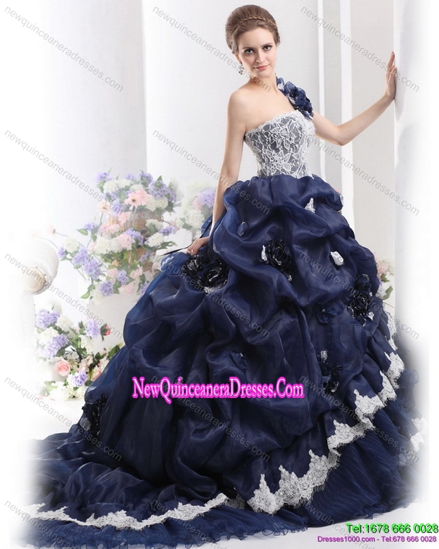 2015 hand-made flower and pick-ups one shoulder dress for quinceanera,