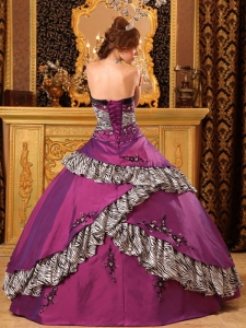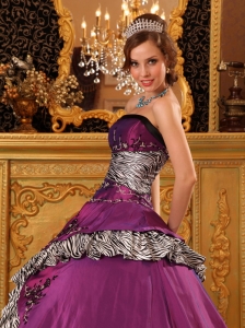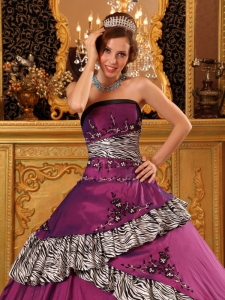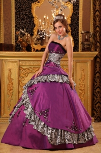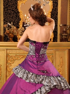 Sugar and Spice! This Quinceanera Ball Gown Dress show your powerful personality in this zebra print quinceanera gown! This dramatic ball gown with lace-up back features asymmetrically winding black and white pleated zebra fabric and ruffled taffeta emblished with floral embroidery in purple which creats a wild effect. A lace up corset style closure in the back secures the dress in place.The belle of the ball should arrive in a dress that will take your breath away !