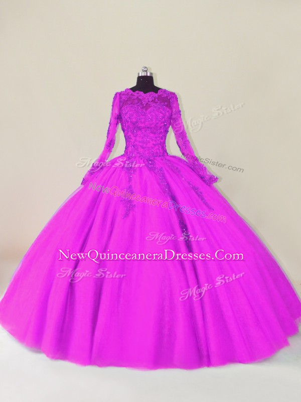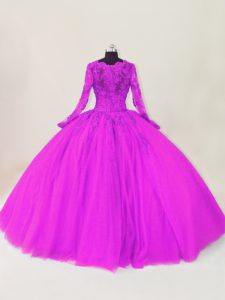 Purple Long Sleeves Floor Length Lace and Appliques Zipper 15 Quinceanera Dress
