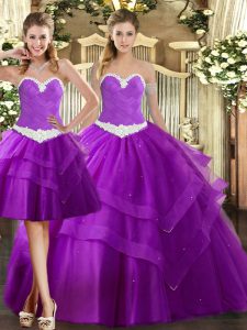 Purple Sleeveless Floor Length Appliques Lace Up Sweet 16 Dresses