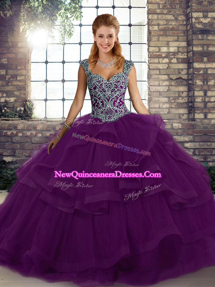 Purple Straps Neckline Beading and Ruffles Quinceanera Gown Sleeveless Lace Up