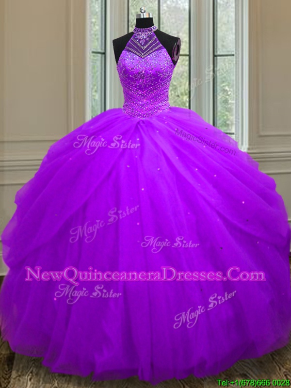 Purple Tulle Lace Up Halter Top Sleeveless Floor Length Quinceanera Gown Beading and Sequins