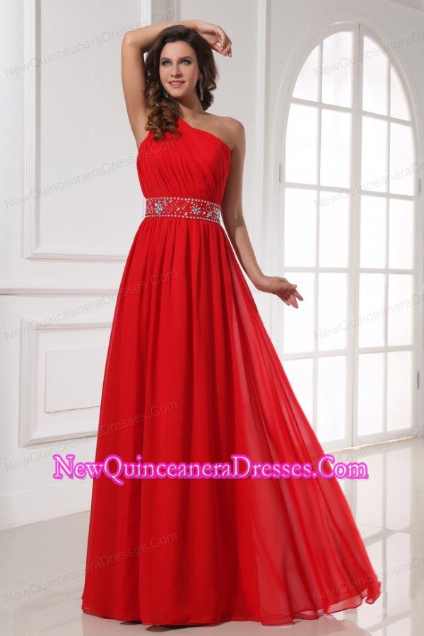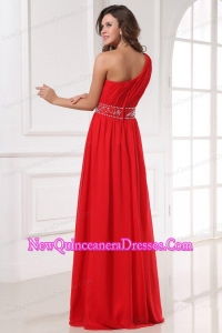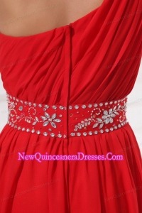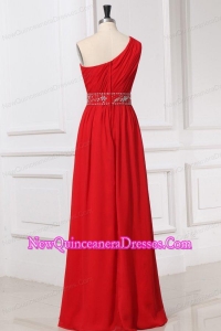 inexpensive zipper up back prom dresses, Red One Shoulder Beaded Decorate Waist Floor-length Dresses for Dama