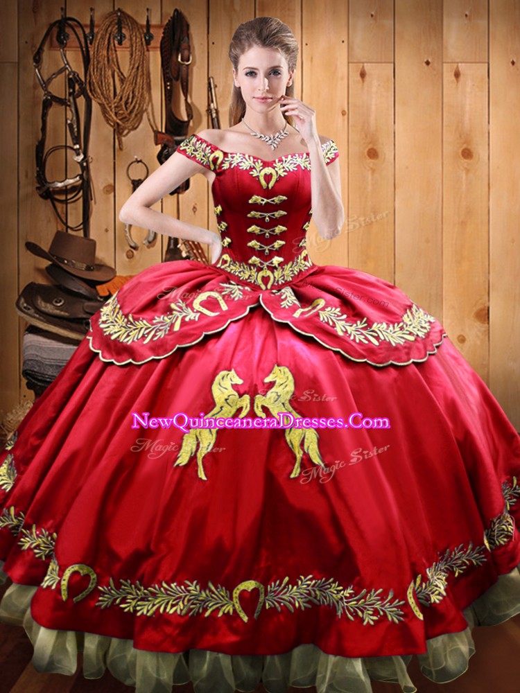 Red Satin and Organza Lace Up Off The Shoulder Sleeveless Floor Length Quince Ball Gowns Beading and Embroidery