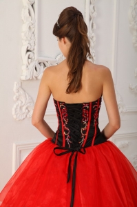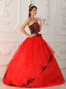 Do you want to be the focal point at the party? This red quinceanera will surely do you a favor. intricate embroidery with glittering beading, and symmetrical red lines encrusted on the corset bodice. The hand-made flower accented on the waist make the dress favorable.The skirt features appliqued trim which creates a beautiful shape of the dress.