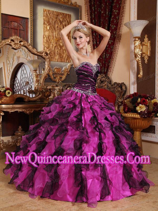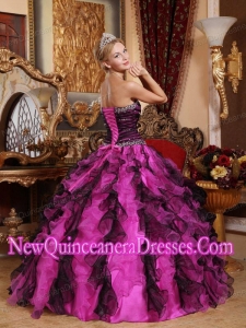 Retty Fuchsia and Black Sweetheart Floor-length Beading and Ruffles Quinceanera Dress