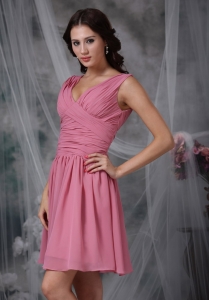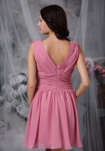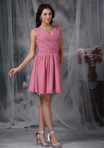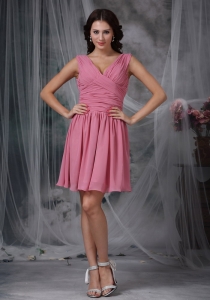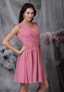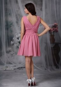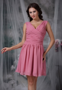 Roes Pink Empire V-neck Mini-length Chiffon Ruch Dama Dresses for Quinceanera