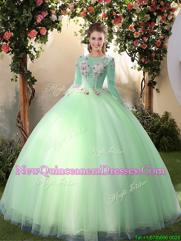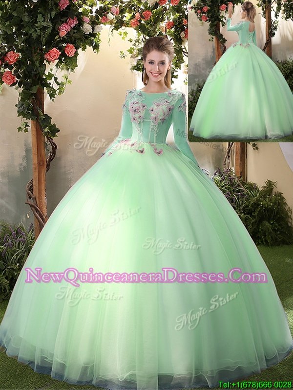 Romantic Scoop Apple Green Long Sleeves Appliques Floor Length Vestidos de Quinceanera