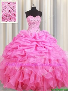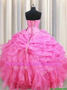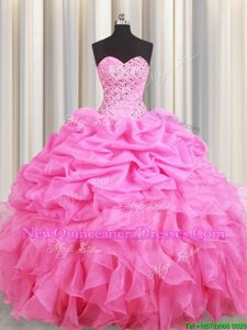 Rose Pink Organza Lace Up Sweetheart Sleeveless Floor Length 15th Birthday Dress Beading and Ruffles and Pick Ups