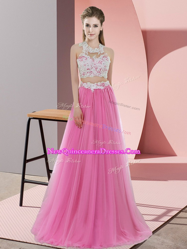 Rose Pink Two Pieces Lace Quinceanera Court Dresses Zipper Tulle Sleeveless Floor Length