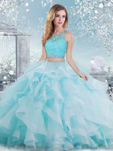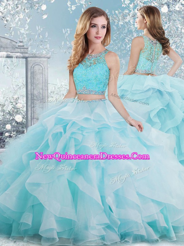 Scoop Sleeveless Clasp Handle Sweet 16 Dresses Aqua Blue Organza