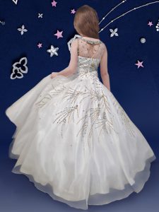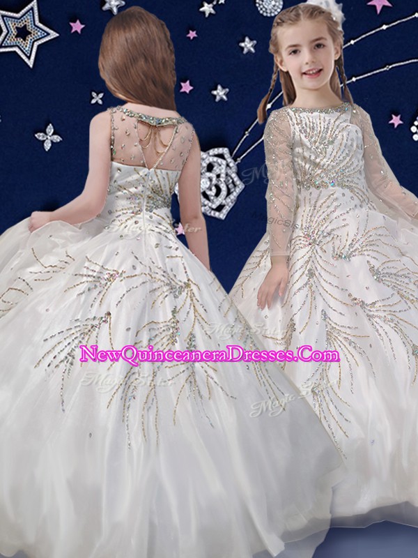 Scoop White Ball Gowns Beading Pageant Gowns For Girls Zipper Organza Long Sleeves Floor Length