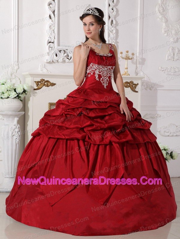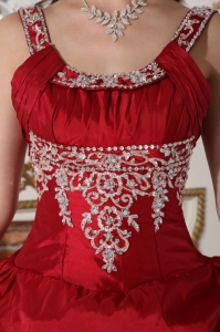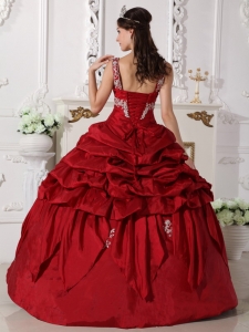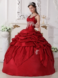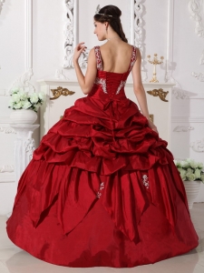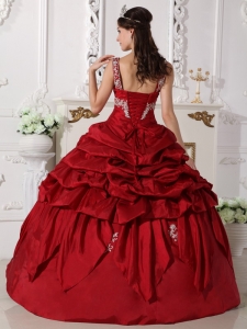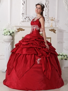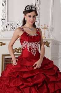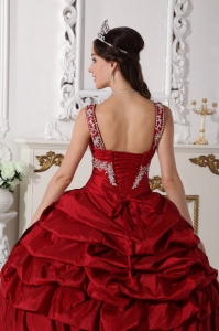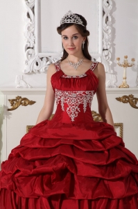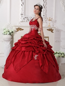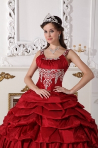 Want to become a princesss on your quinceanera day? Here is the dress to make your dream come true! This chic burgundy quinceanera dress is featured with a special bodice with the mid-section adorned with beaded embroidery and straps encrusted with beadings. The pick ups and handkerchief hemed pieces of fabric on the skirt add beauty and grace to the dress.
