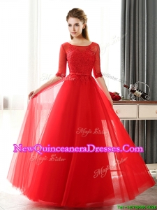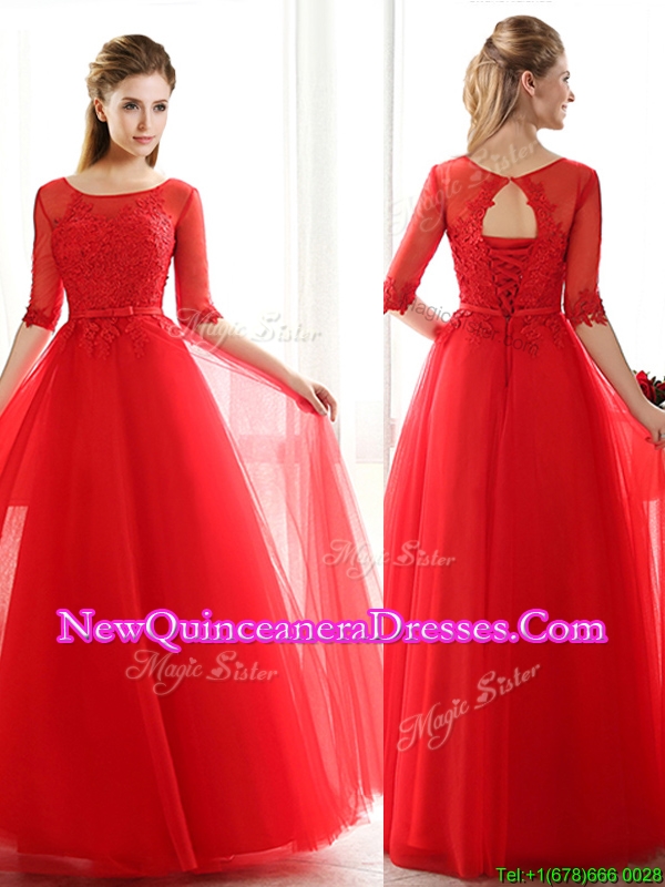 See Through Scoop Half Sleeves Red Damas Dress with Lace and Belt