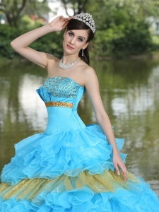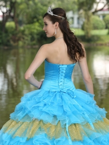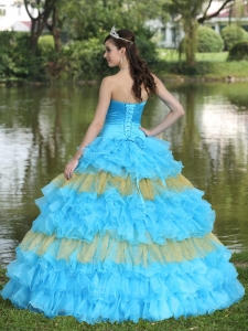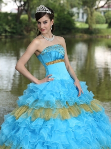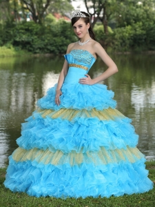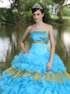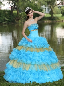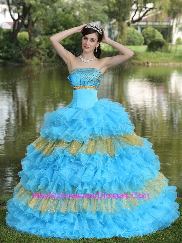 inexpensive quinceanera dresses, Beaded Decorate Bust Sequins Organza Aqua Blue and Yellow Strapless Floor-length Tiered Sweet Quinceanera Dress For 2013