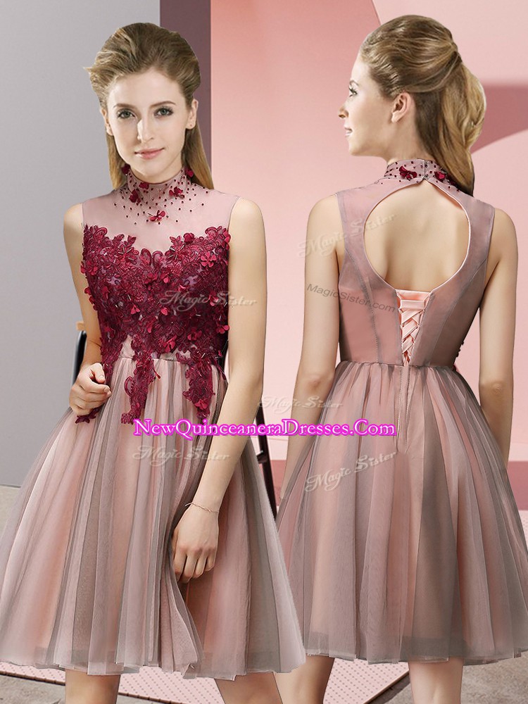 Sexy Peach Damas Dress Prom and Party and Wedding Party with Appliques High-neck Sleeveless Lace Up
