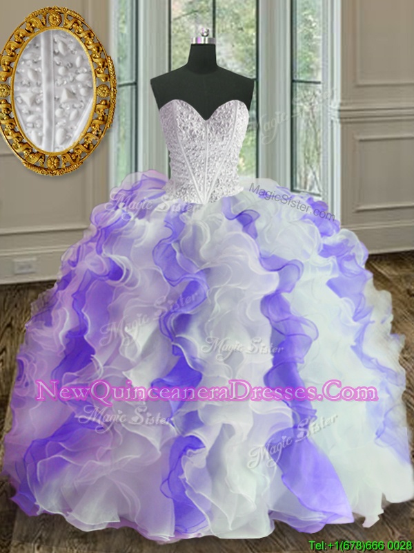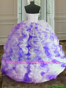 Simple Sleeveless Floor Length Beading and Ruffles Lace Up Quince Ball Gowns with White and Purple