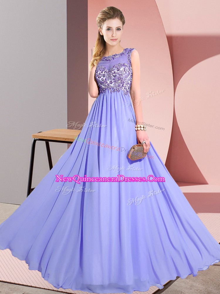 Sleeveless Chiffon Floor Length Backless Quinceanera Dama Dress in Lavender with Beading and Appliques