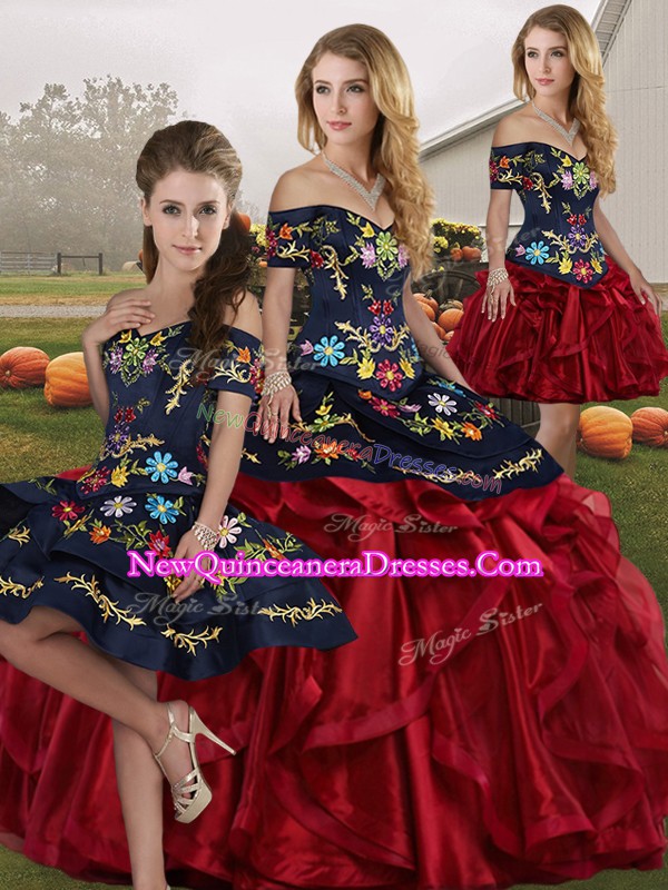 Sleeveless Organza Floor Length Lace Up Sweet 16 Dress in Red And Black with Embroidery and Ruffles