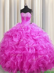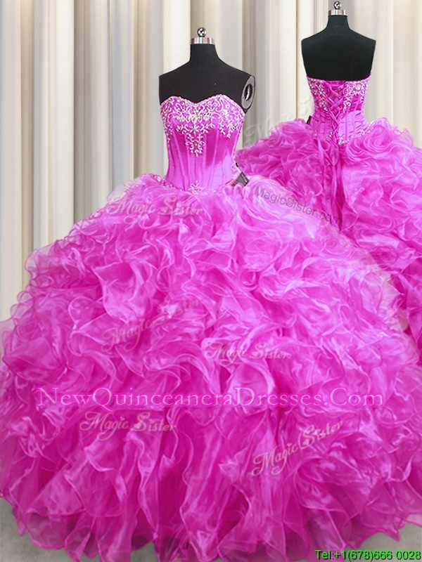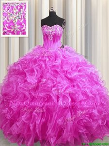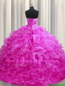 Sleeveless Organza Sweep Train Lace Up Sweet 16 Dresses inFuchsia withBeading and Ruffles