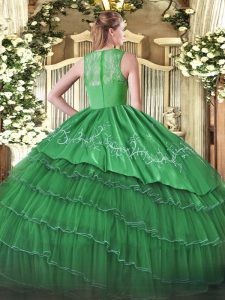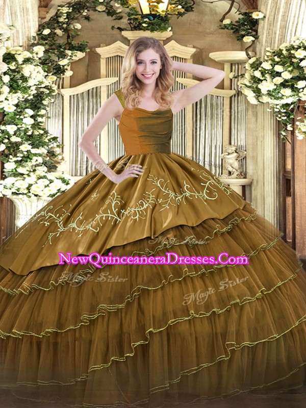 Sleeveless Satin and Organza Floor Length Zipper Quinceanera Dresses in Brown with Embroidery and Ruffled Layers