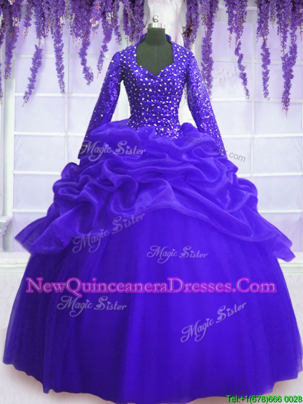 Smart Sequins Pick Ups Royal Blue Long Sleeves Organza Zipper Sweet 16 Dresses for Military Ball and Sweet 16 and Quinceanera