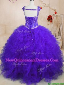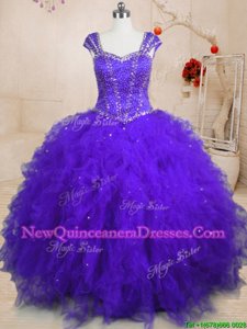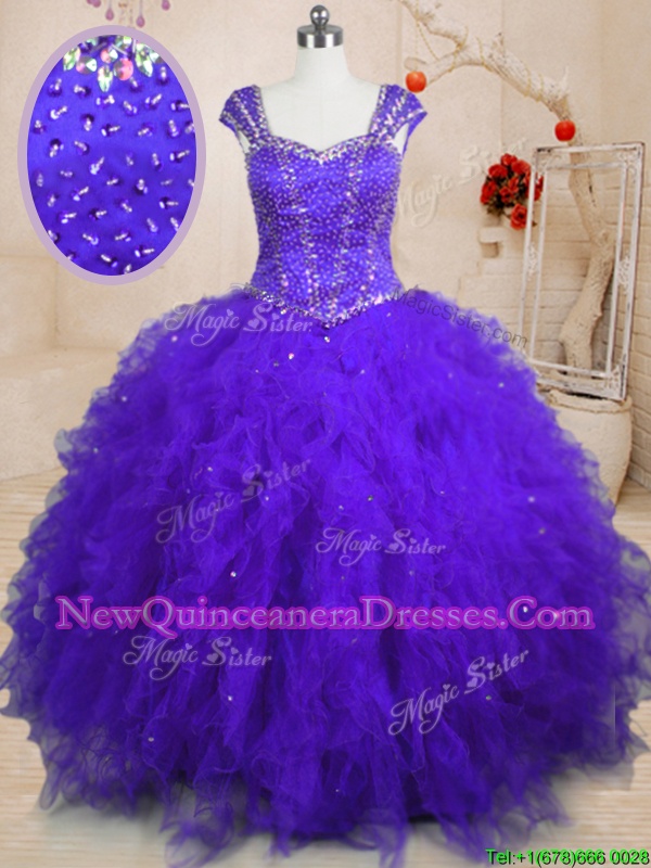 Square Cap Sleeves Quinceanera Dresses Floor Length Beading and Ruffles and Sequins Purple Tulle