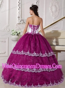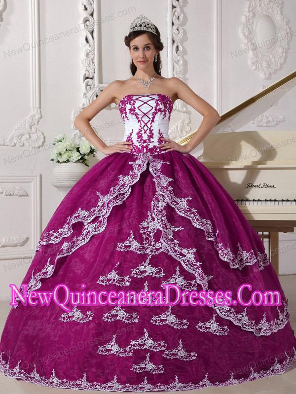 Strapless Floor-length Organza Appliques Puffy Sweet 16 Gowns in Fuchsia and White