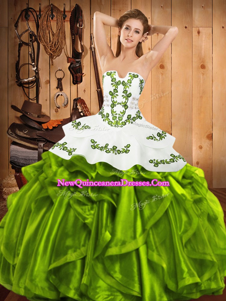 Strapless Sleeveless Satin and Organza Quinceanera Gown Embroidery and Ruffles Lace Up