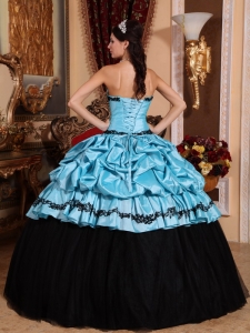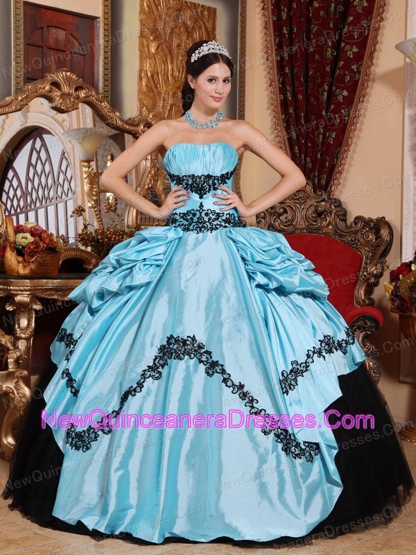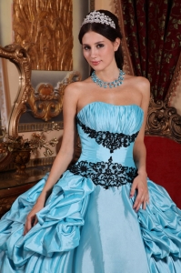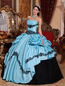 Simple Baby Blue and Black Sweet 16 Dress Strapless Taffeta Appliques Ball Gown