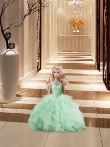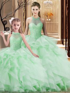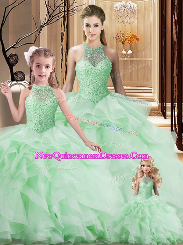 Super Apple Green 15th Birthday Dress Sweet 16 and Quinceanera with Beading and Ruffles Halter Top Sleeveless Brush Train Lace Up