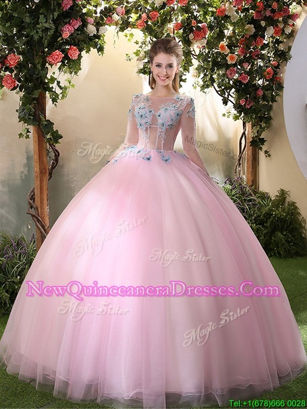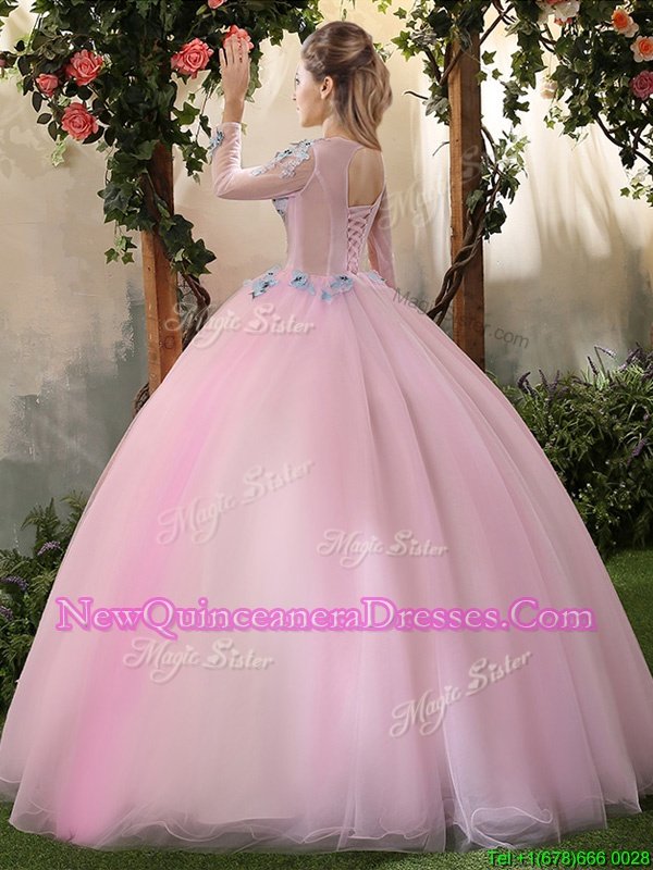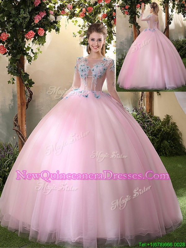 Superior Scoop Floor Length Baby Pink Quinceanera Gown Tulle Long Sleeves Spring and Summer and Fall and Winter Appliques