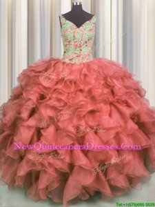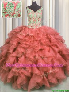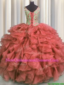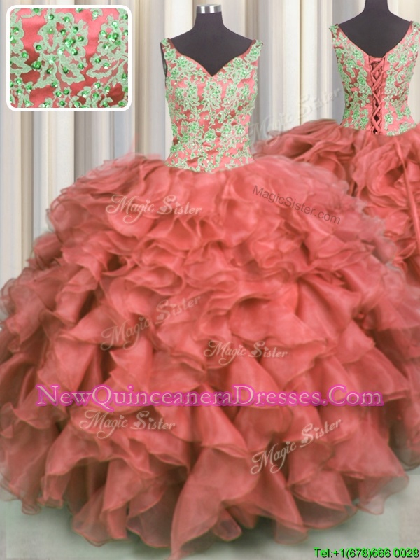 Superior V Neck Beading and Ruffles Sweet 16 Dress Coral Red Lace Up Sleeveless High Low