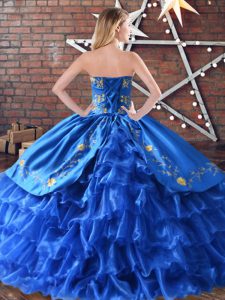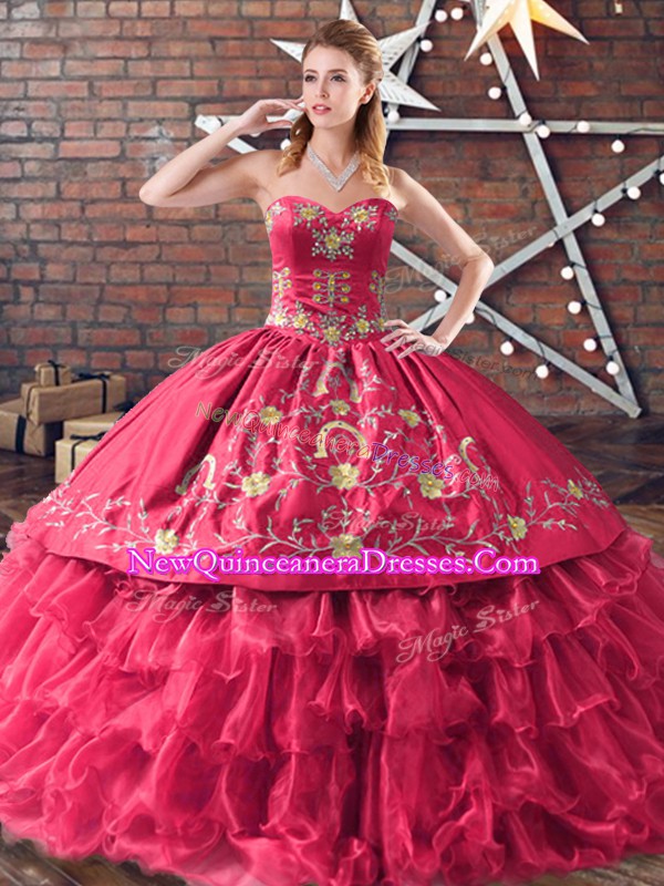 Sweetheart Sleeveless Sweet 16 Dresses Floor Length Embroidery and Ruffled Layers Red Satin and Organza