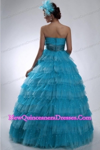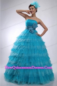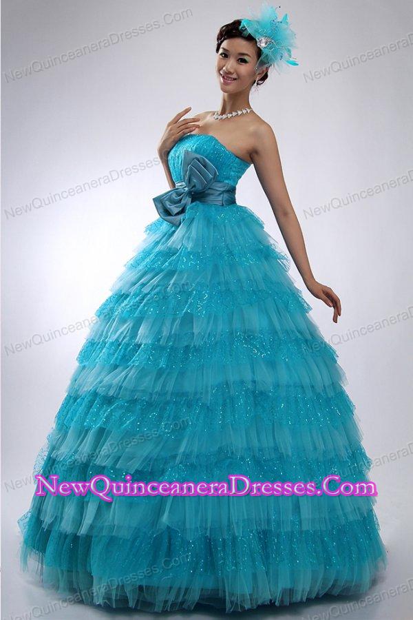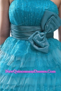 Teal Strapless Tulle and Sequins Long Quinceanera Dress with Bowknot