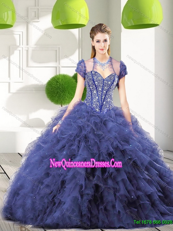 lovely organza quinceanera dress with wraps in 2015, Trendy Navy Blue Quinceanera Gown with Beading and Ruffles for 2015