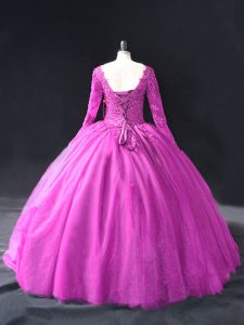 Tulle V-neck Long Sleeves Lace Up Lace and Appliques 15th Birthday Dress in Fuchsia