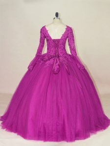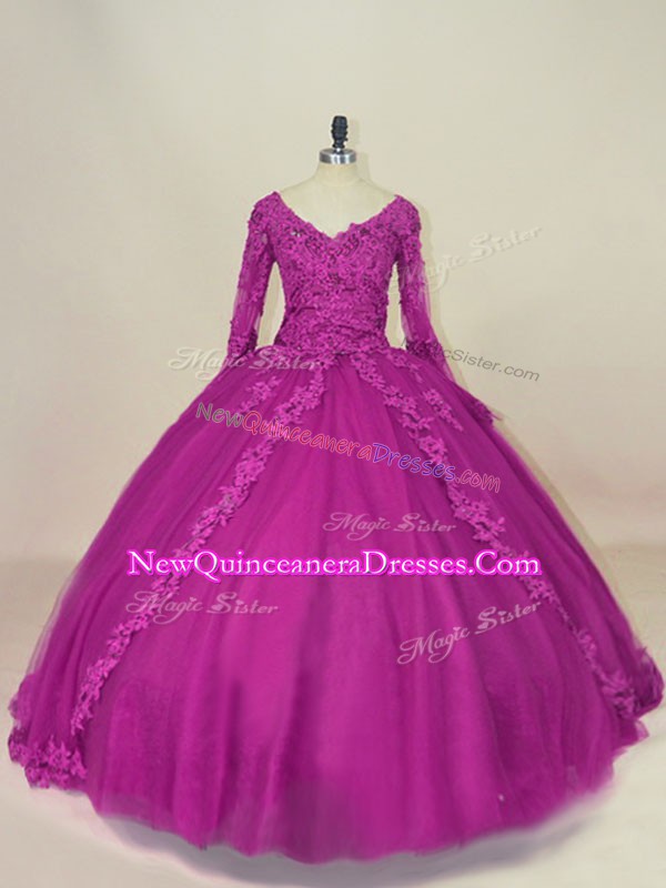 V-neck Long Sleeves 15th Birthday Dress Floor Length Lace and Appliques Fuchsia Tulle