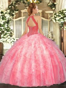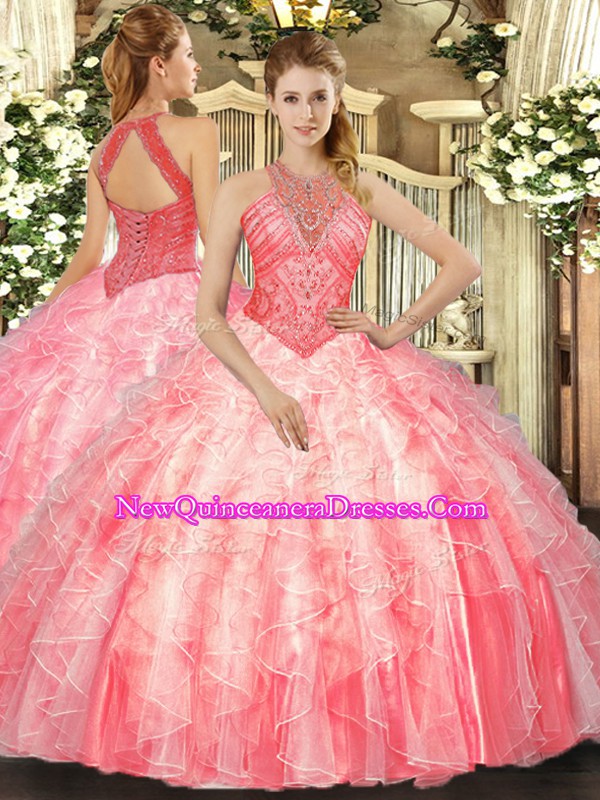 Watermelon Red High-neck Lace Up Beading and Ruffles 15 Quinceanera Dress Sleeveless