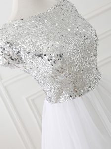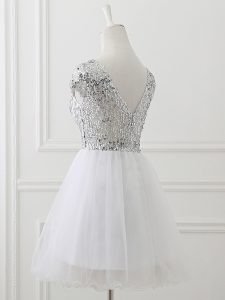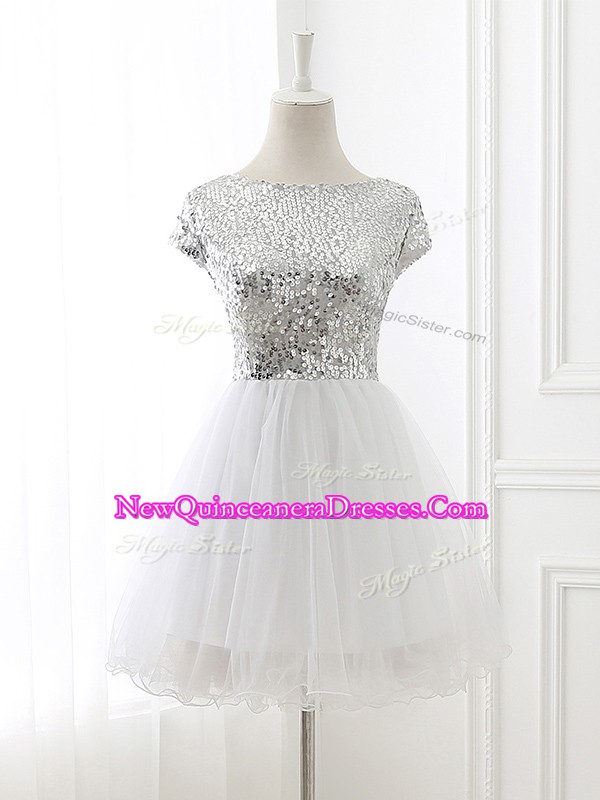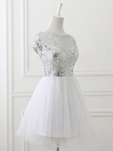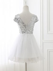 White A-line Sequins Quinceanera Dama Dress Zipper Tulle Cap Sleeves Mini Length