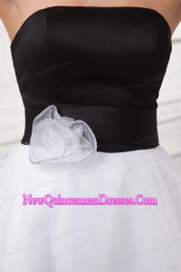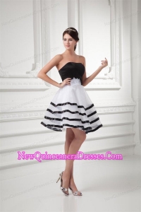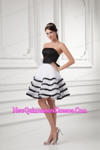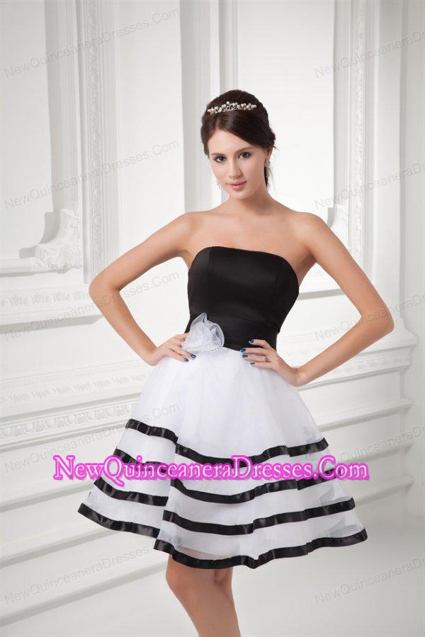 White and Black A-line Strapless Mini-length Organza Dama Dress for Quinceanera with Ruffled Layers