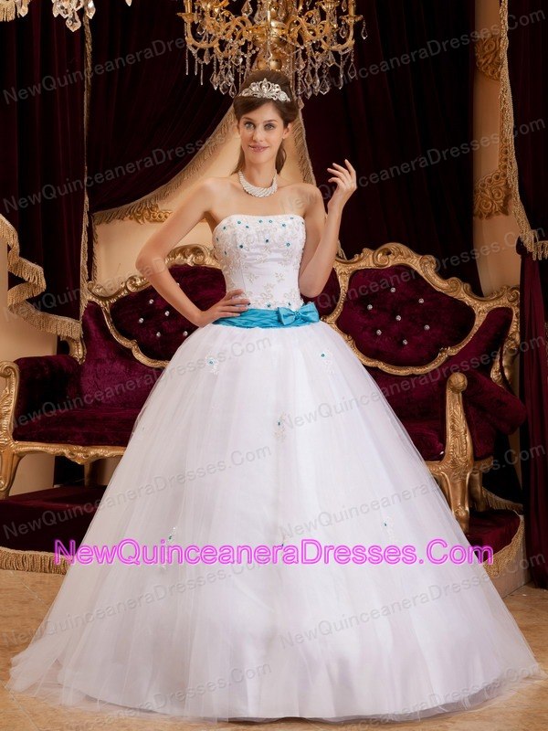 Fashionable White Quinceanera Dress Strapless Satin Appliques Ball Gown