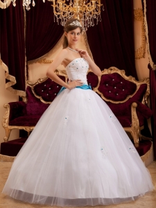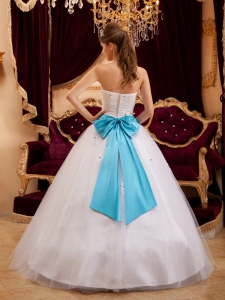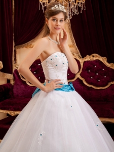 A cute and lovely white wedding gown features with a sexy strapless neckline and a ruched blue band with asmall bow on the front and a extremly big bow on the bottom add the sassy look. The appliques encrusted with blue crystal add the delicate effecting. The layers of organza give you the feel of soft and smooth. A zipper up corset style closure in the back secures the dress in place.