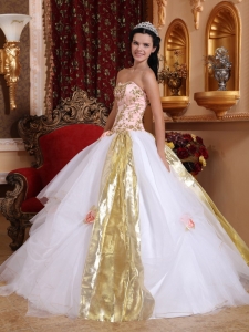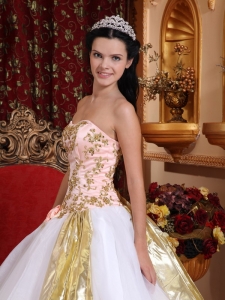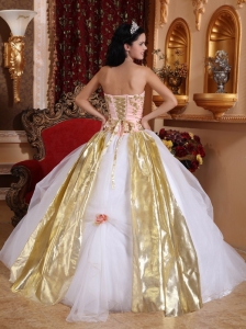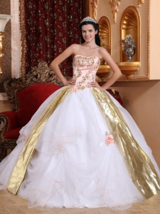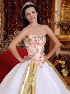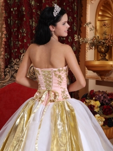 Popular Gold Quinceanera Dress Strapless Organza Embroidery Ball Gown