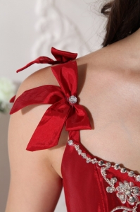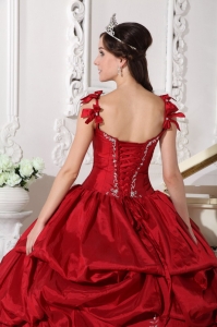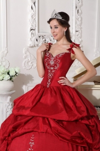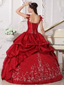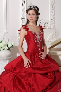 Modest Wine Red Quinceanera Dress Straps Floor-length Taffeta Embroidery Ball Gown