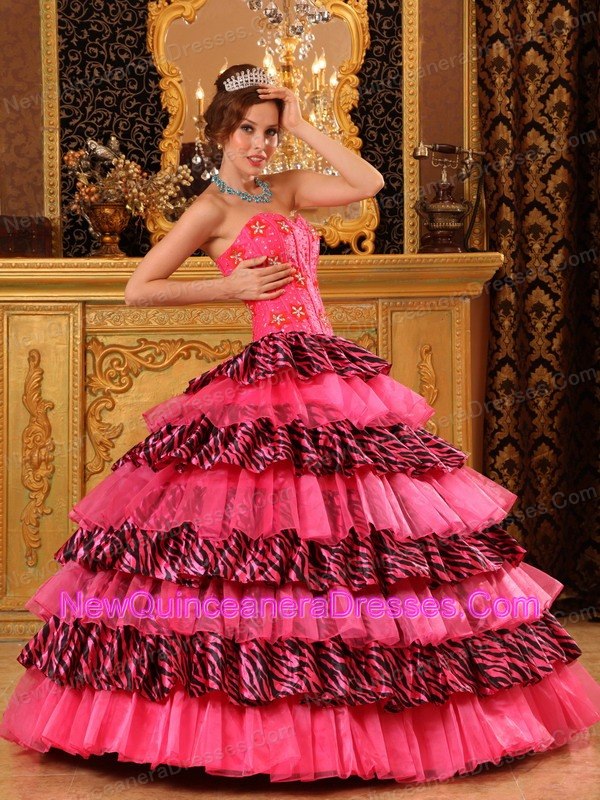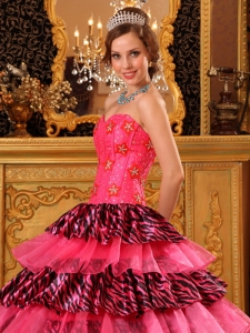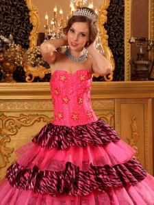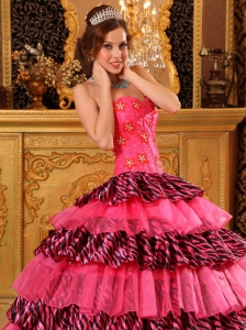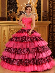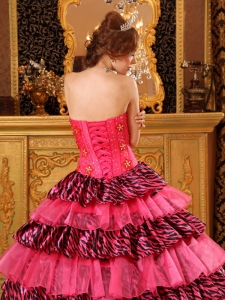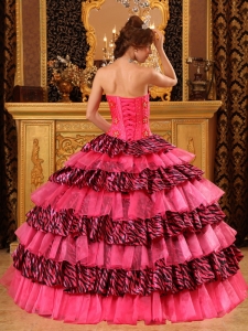 Elegant Rose Pink Quinceanera Dress Strapless Picks-Up Organza and Zebra Ball Gown